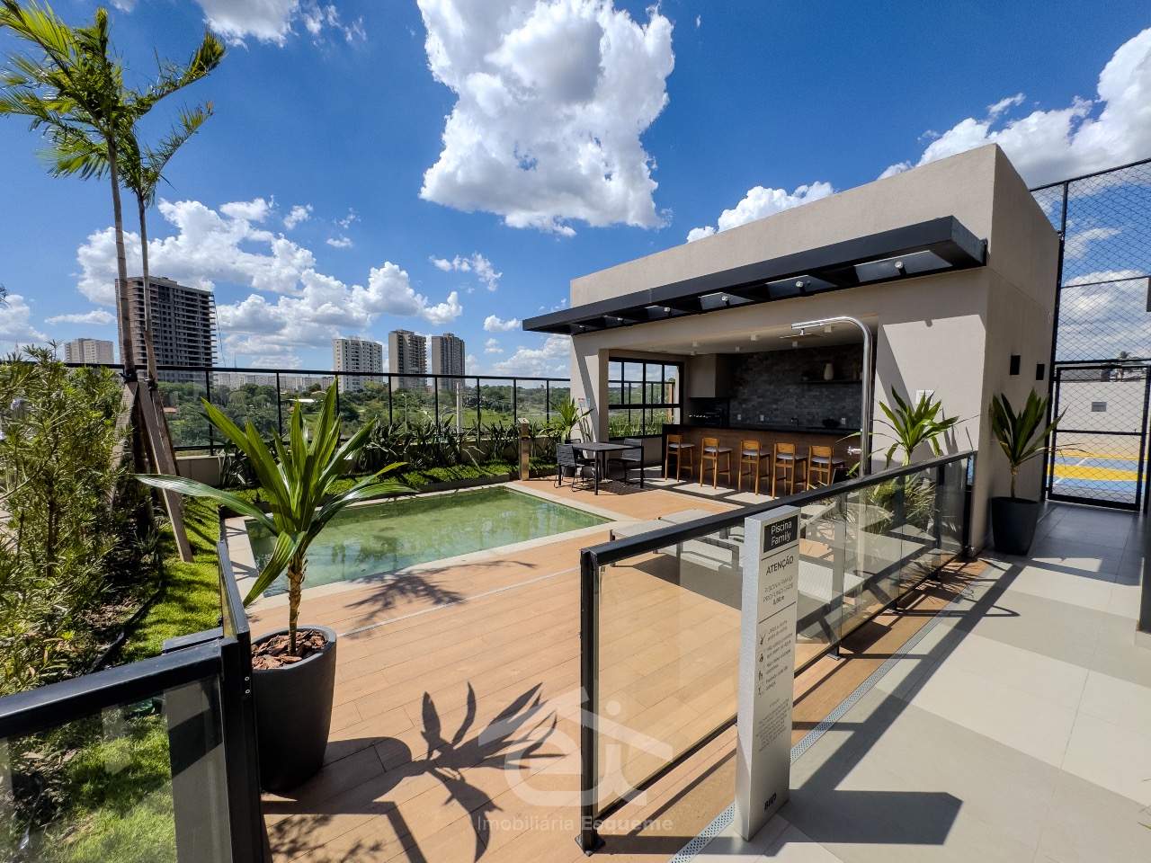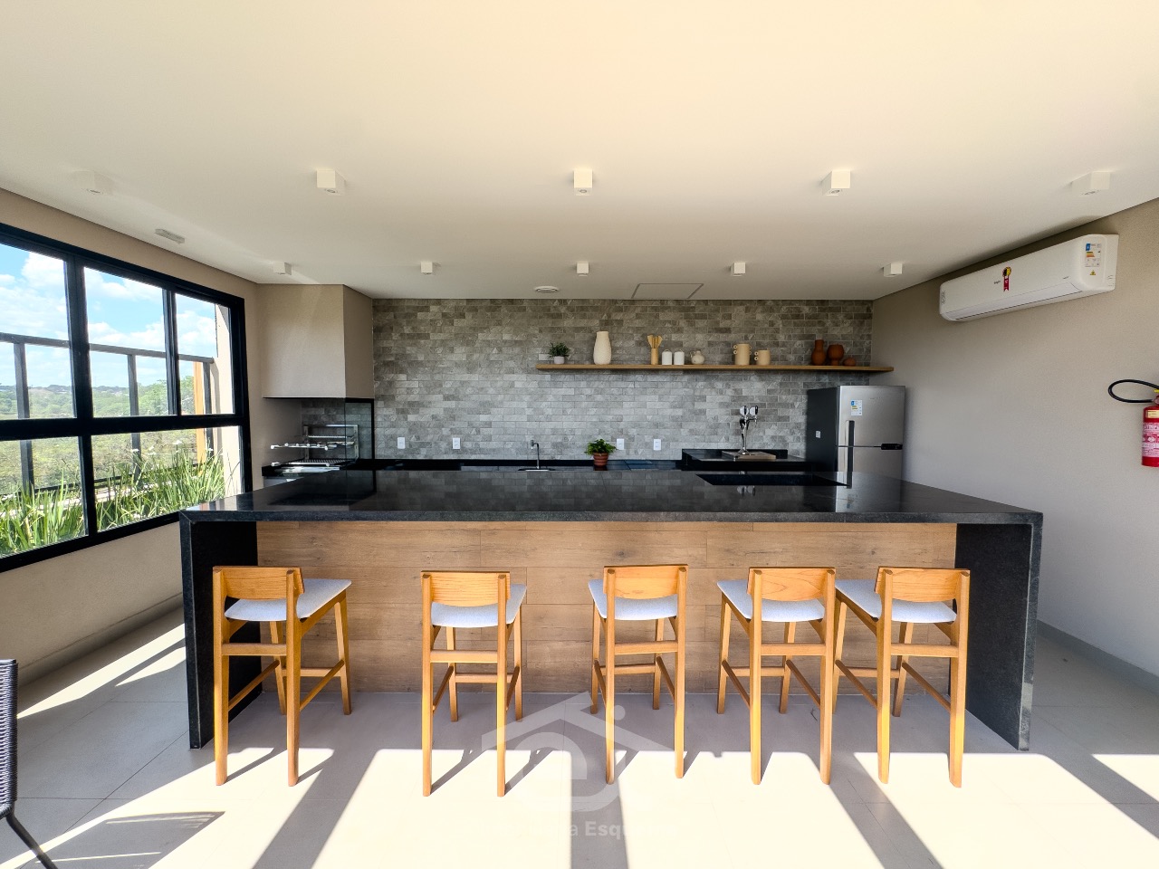 - Varanda gourmet com churrasqueira a carvão e pia;
